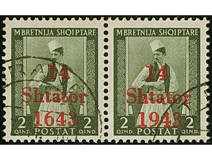 2 Qind schwärzlichbraunoliv, waagerechtes Paar, dabei die linke Marke mit Setzfehler “1643 statt 1943”, sauber gestempelt, tadellos, in gestempelter Erhaltung sehr selten, Fotoattest Brunel (2006)