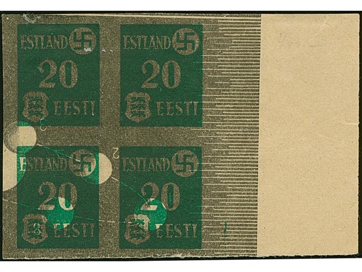 1941, Landespost 20 Kopeken dunkelsmaragdgrün, ungezähnter Probedruck auf russichem Buch- bzw. Zeitungspapier, Rand-Viererblock, ohne Gummi wie verausgabt, tadellos, sign. Krischke mit Fotoattest (2010)