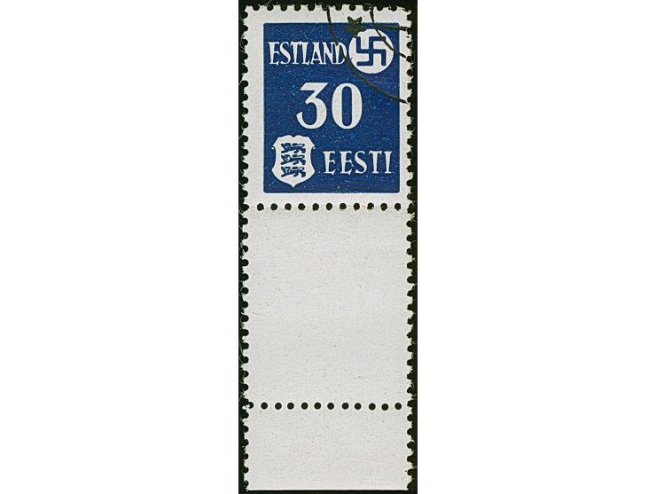 1941, Landespost 30 Kopeken schwarzultramarin, mit kompletten Leerfeld in Markengröße und Bogenrand unten, sauber gestempelt, tadellos. Sehr selten, wenngleich die Auflage 10 Stück betragen soll, hat ProFi nur dieses Stück registriert, Fotoattest Krischke BPP (2004)