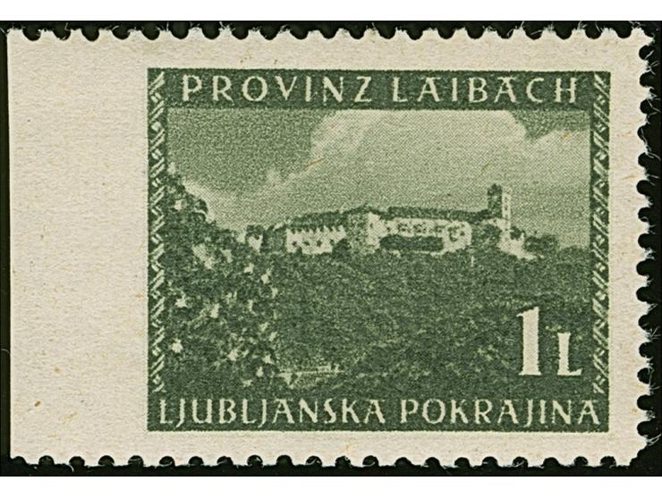 1945, Ansichten aus Slowenien Alte Burg in Laibach 1 Lire schwärzlichgraugrün, Seitenrandstück links ungezähnt, postfrisch, tadellos. Eine sehr seltene Marke mit einer Auflage von lediglich 20 Stück, von denen wir jedoch nur 5 Stück in ProFi lokalisieren können, unsigniert mit Fotoattest Krischke (2010)