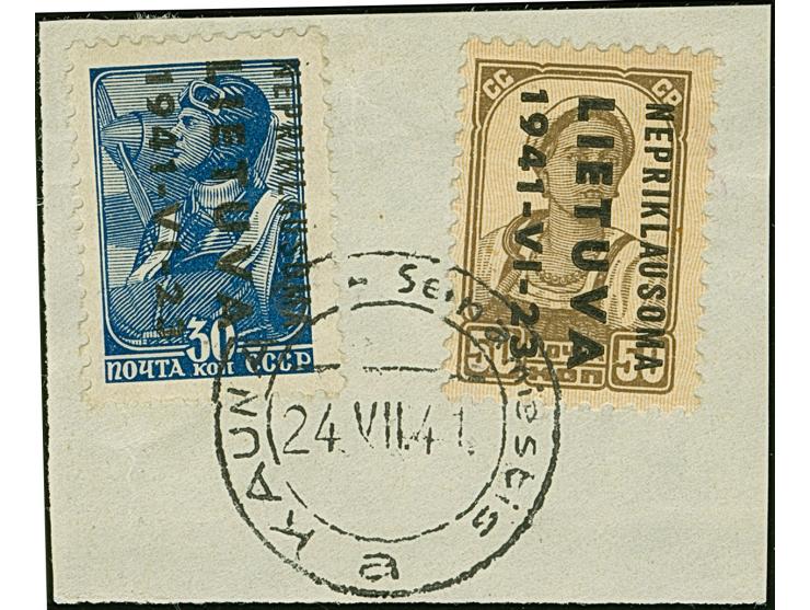 1941, Nepriklausoma 30 Kopeken violettultramarin und 50 Kopeken braun, je mit kopfstehendem Aufdruck, sauber mit Stempel “KAUNAS-Senamiestis 24.VII.41” auf Briefstück, tadellos, in gestempelter Erhaltung sehr selten, sign. EKeiler und Fotoattest Krischke BPP (1986)