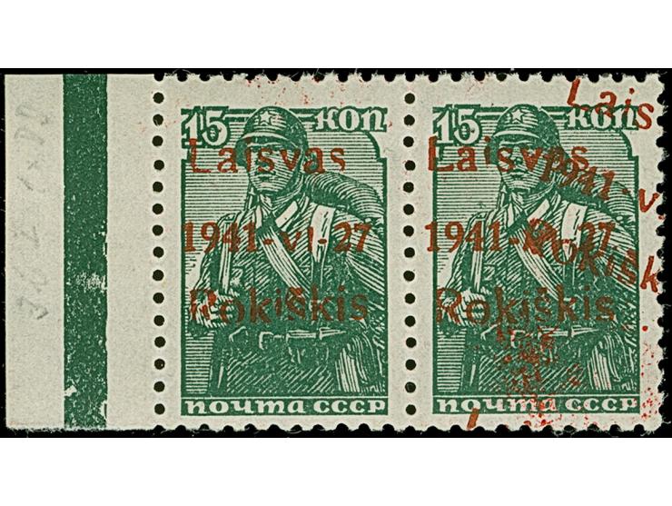 1941, 15 Kopeken dunkelgraugrün, braunroter Aufdruck, waagerechtes Paar mit linkem Seitenrand, die rechte Marke mit doppeltem Aufdruck, der zweite Aufdruck um ca. 15° nach rechts unten gekippt und schräg verlaufend, postfrisch, tadellos. Eine seltene Abart mit nur wenigen bekannten Stücken, als Paar besonders dekorativ, sign. EKeiler sowie Fotoattest Huylmans BPP (2018)