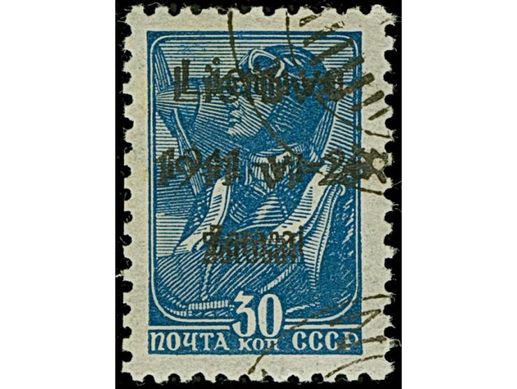 1941, 30 Kopeken violettultramarin, mit schwarzem, doppelten Aufdruck mit Aufdruckfehler “Vi statt VI im Datum”, der 2. Aufdruck um ca. 0,5mm nach rechts verschoben, sauber gestempelt, tadellos. Nach unseren Unterlagen sind nur 2 Bogen mit Doppelaufdruck überdruckt worden, Gesamtauflage dieser Abart damit lediglich zwei Stück, wobei das andere bisher nicht registriert ist, Fotoattest Krischke BPP (1991)