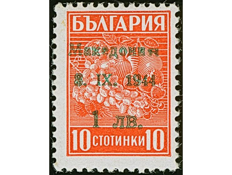 1944, 1 Lew auf 10 Stotinki mit grünem statt blauem Probeaufdruck mit breitem Я in "Makedonia", welches vor dem endgültigen Druck gegen ein kleines ausgewechselt wurde, sauber ungebraucht, tadellos, selten, Fotoattest Brunel BPP (2009)