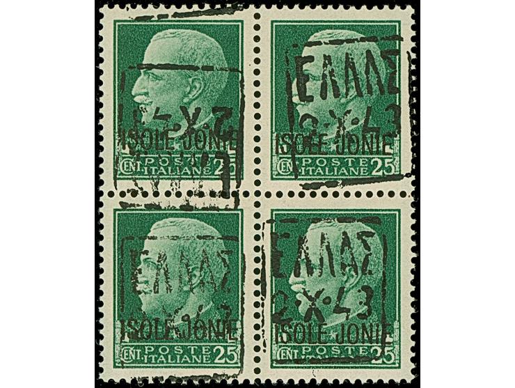 1943, 25  Centesimi schwarzgrün, Viererblock, die linke obere Marke mit kopfstehendem Aufdruck, die drei weiteren mit normalstehendem Aufdruck, postfrisch, tadellos, eine seltene und dekorative Einheit, sign. A. Diena sowie Ludin BPP mit Fotoattest (1978)