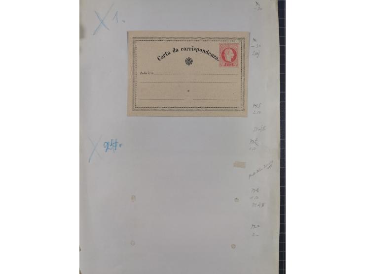 1869/1900, Sammlung von über 100 meist verschiedenen Ganzsachenkarten, überwiegend ungebraucht, spezialisiert mit Katalognummern auf sehr alten Blättern teils mit Falz befestigt, dabei auch Lombardei etc., urig.