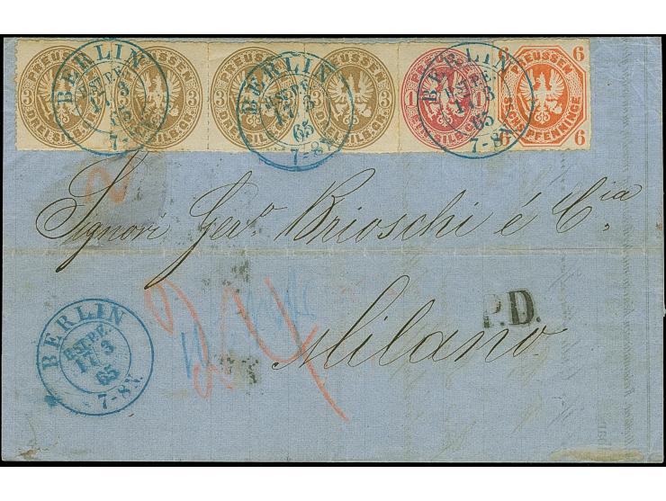 3 Sgr. ocker, waagerechter 3er-Streifen und Einzelstück, mit 1 Sgr. karmin und 6 Pfg. orange, mit sauber auf- und nebengesetztem DKr. "BERLIN H.ST.P.E. 17/3 65" auf rückseitig nicht ganz komplett war Briefhülle der 2. Gewichtsstufe über die Schweiz nach Mailand. Eine sehr seltene Frankaturkombination.