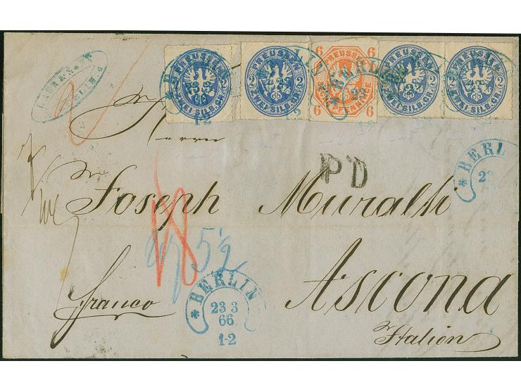 6 Pfg. orange, durch fast fehlenden waagerechten Durchstich teils Scherentrennung, abwechselnd geklebt mit 4 Einzelwerten 2 Sgr. ultramarin, mit blauem Hufeisenstempel "BERLIN 23 3 66" auf Briefhülle nach "Ascona in Italien" (obwohl Ascona in der Schweiz liegt). Aufgrund der Adresse wurde der Brief als in die 2. italienische Gewichtsstufe fallend markiert und dafür portogerecht frankiert, mit 3 Silbergroschen Vereinsporto, 2 Sgr. Schweizer Transit und und 3½ Sgr. italienischem Porto; das korrekte Porto in die Schweiz hätte lediglich 5 Silbergroschen betragen. Ein ungewöhnlicher und attraktive Auslandsbrief.