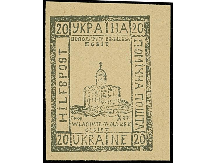 AUSGABE FÜR WLADIMIR-WOLYSNK: 10 und 20 Gr., insgesamt 9 verschiedene Werte, in teils nur leicht unterschiedlichen Nuancen, 20 K. auf verschiedenen Papieren, fast alle sign. Zirath oder Pickenpack (Maksymczuk #40-41)