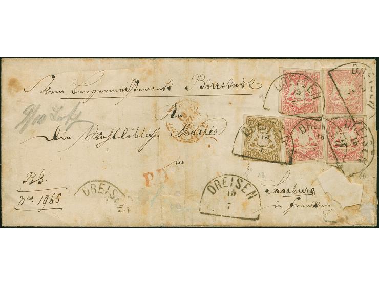 3 Kr. rosa, 4 Einzelstücke in teils unterschiedlichen Nuancen und 6 Kr. ockerbraun, alle voll-bis breitrandig und einwandfrei, mit Halbkreis "DREISEN 15/7" (1869) auf im Inland portofreier Dienstbriefhülle der 2. Gewichtsstufe nach Saarburg in Frankreich. Die Hülle mit Faltungen außerhalb der Frankatur, vorderseitiger Fehlstelle und etwas unfrisch. Eine in dieser Form einmalige Teilfrankatur. Fotoattest Sem BPP (2023)