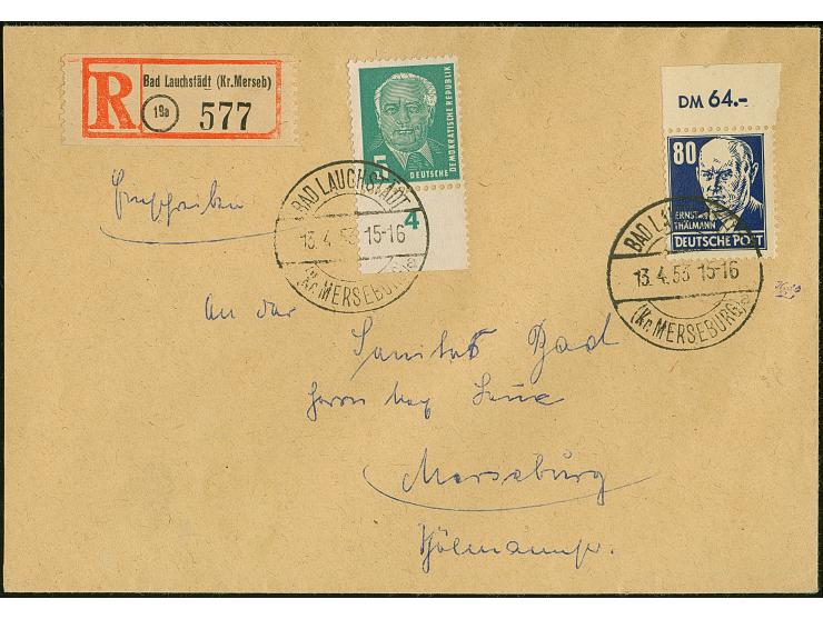 1952, Persönlichkeiten 80 Pfg. auf gestrichenem Papier mit Lacküberzug, zusammen mit Pieck 5 Pfg., sauber mit Stempel “BAD LAUCHSTÄDT 13.4.53” auf portogerechtem R-Brief nach Merseburg mit Ankunftsstempel, tadellos, Fotoattest Dr. Ruscher BPP (2025)