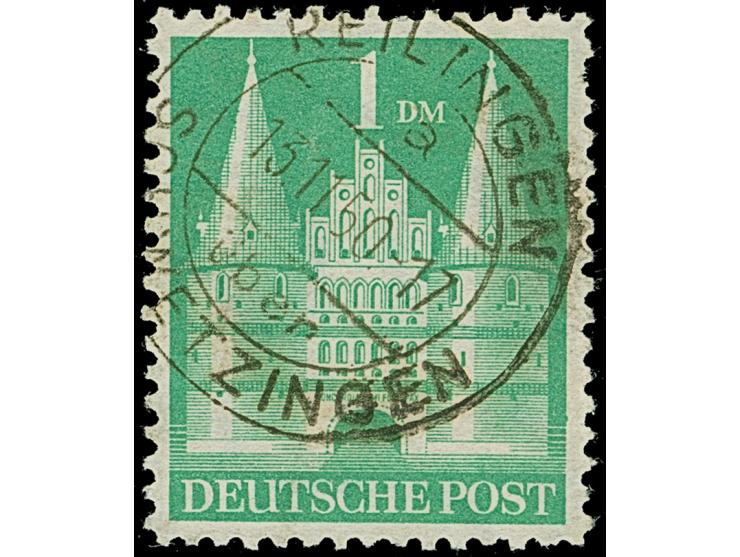 1 M. mittelgelblichgrün, Type II, gezähnt L 11 und mit Wasserzeichen “steigende Wellenlinien” (WZ. 3Y), sehr sauber mit Stempel “REILINGEN über SCHWETZINGEN 13.11.50” entwertet. In der Zähnung fehlt rechts oben ein Zahn und oben hat die Marke einen kurzen Zahn, ansonsten in einwandfreier Erhaltung. Fast alle Marken mit dieser Wasserzeichen-Abart haben kleine Fehler bzw. sind fehlerhaft. Ein optisch ansprechendes Exemplar mit sehr schöner Entwertung, Fotoattest Rolle BPP (2026)