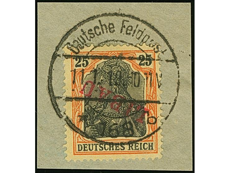 1919, Aufdrucktype II, roter Aufdruck: Germania 25 Pfennig rotorange auf gelbweiß, kopfstehender Aufdruck, farbfrisch und gut gezähnt, sauber mit Stempel “Deutsche Feldpost * 168 b 11.1.19.” auf Briefstück, zur Kontrolle gelöst, winziger Eckbug, sonst tadellis, sign. Schlegel BPP sowie Fotoattest Huylmans BPP (2026)
