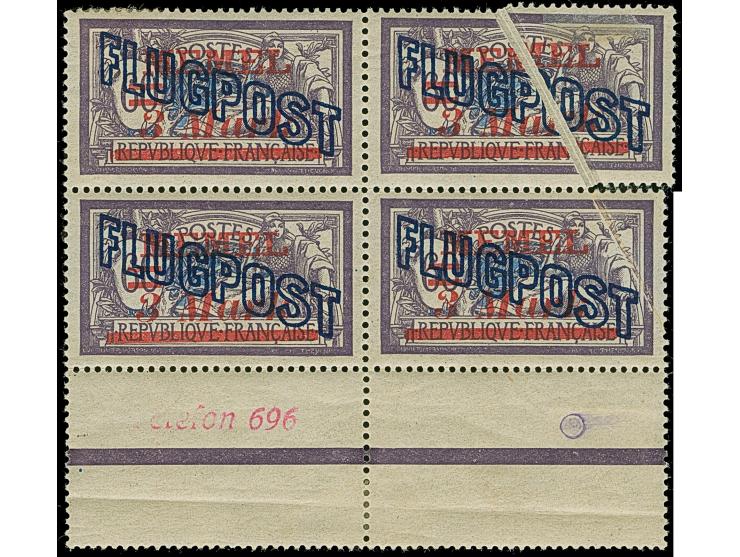 1921, Flugpost 3 Mark auf 60 Cent dunkelgrauviolett, Viererblock mit Zwischenstegansätzen unten, die rechten Marken mit sehr markanter Papierfalte, der linke obere Wert ungebraucht, sonst postfrisch, eine seltene und dekorative Einheit, tadellos, im Bogenrand sign.