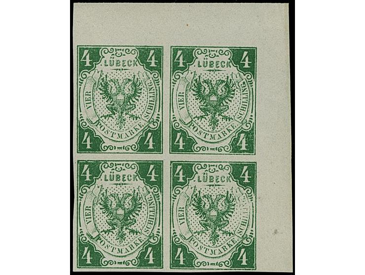 Neudrucke 1872: ½-4 Sch. kpl. in 4er-Blocks, voll- bis breitrandig, 1 Sch. etwas oxidiert, sonst und sehr schön farbfrisch, ungebraucht, Marken meist postfrisch