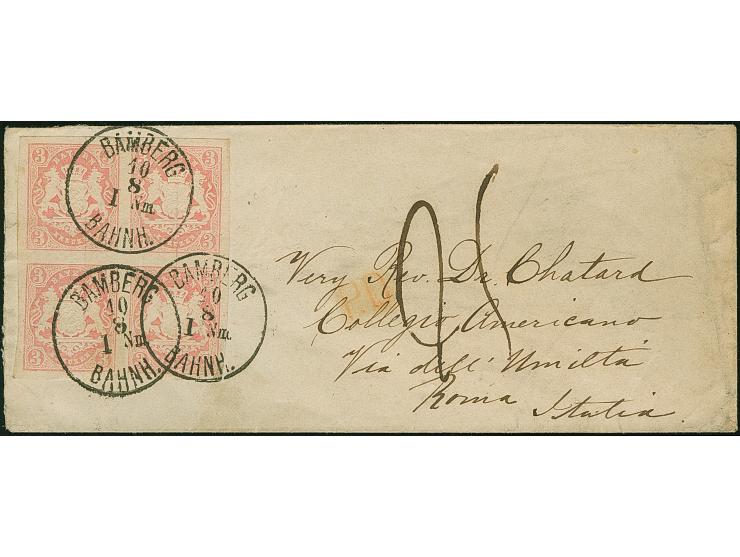 3 Kr. rosa im 4er-Block, farbfrisch und allseits breitrandig, mit sauber aufgesetztem EKr. "BAMBERG BAHNH. 10 8" (1869) auf kleinem Briefkuvert nach Rom im Kirchenstaat. Eine der besten Block-Frankaturen dieser Marke; mit dieser Destination hat PROFI keinen weiteren Beleg registriert.