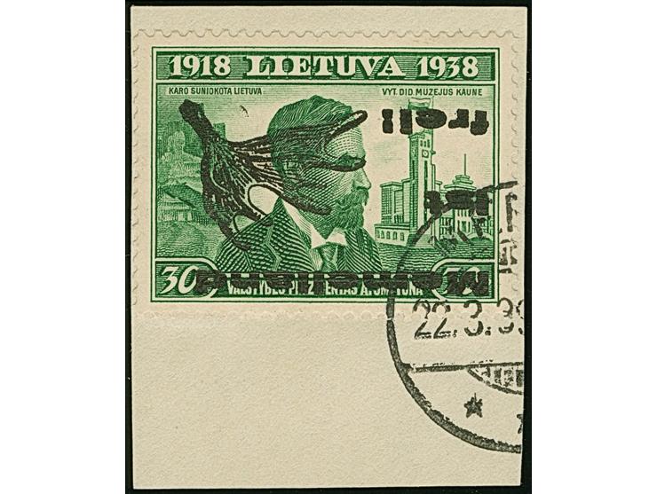 1939, Elchschaufel 30 Centu, kopfstehender Aufdruck in Type I, sauber mit Stempel “MEMEL 22.3.39” auf Briefstück, tadellos