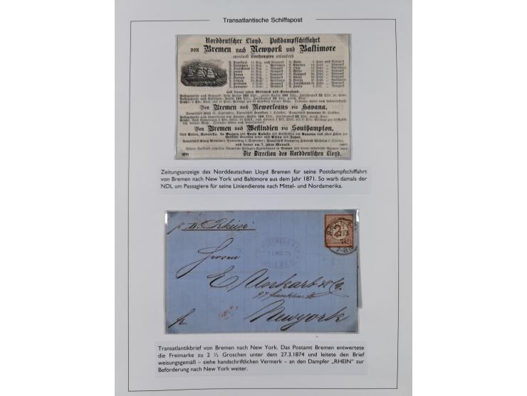 1824/82, ca. 40 Briefe, Karten und Ganzsachen ab Vorphila mit interessanten Stempeln, frankierte Belege mit Destination USA von Preußen mit zweimal 6½ Gr.-Frankaturen Kopfausgaben (1x GSU mit Zufrankatur), Sachsen mit 7½ Ngr.-Frankatur Johann I. Ausgabe, Thurn & Taxis und NDP sowie unfrankierter Faltbrief aus Bremerhaven 1865 nach Norwegen. Dazu etwas Ausland und Deutsches Reich Mi.-Nr. 21a auf Brief 1874 nach New York und drei Briefe 1879-82 von Hamburg nach Veracruz