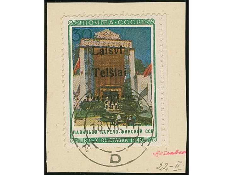 1941, Karelo-Finnische SSR 30 Kopeken, Aufdrucktype II, Aufdruckfeld 12, kurzes Seitenrandstück, sauber mit Stempel “TELSIAI 18.VII.41” auf Briefstück, tadellos, u.a. sign. EKeiler