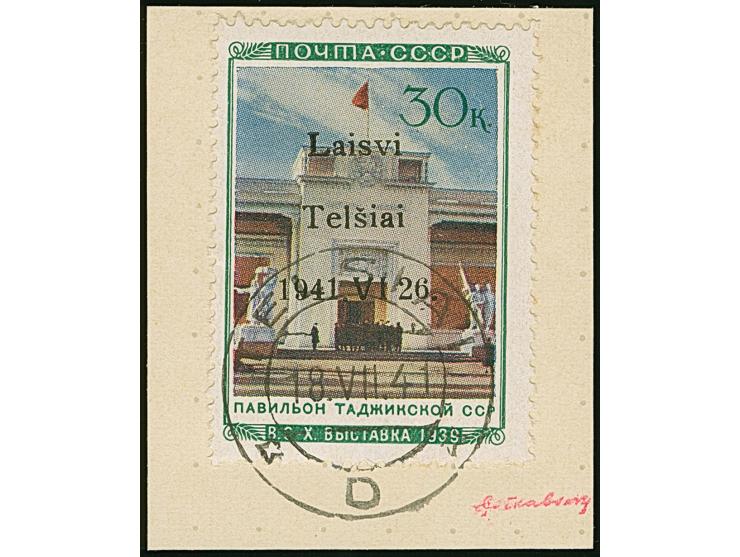 1941, Taschikische SSR 30 Kopeken, Aufdrucktype I, Aufdruckfeld 26, sauber mit Stempel “TELSIAI 18.VII.41” auf Briefstück, tadellos, u.a. sign. Pickenpack