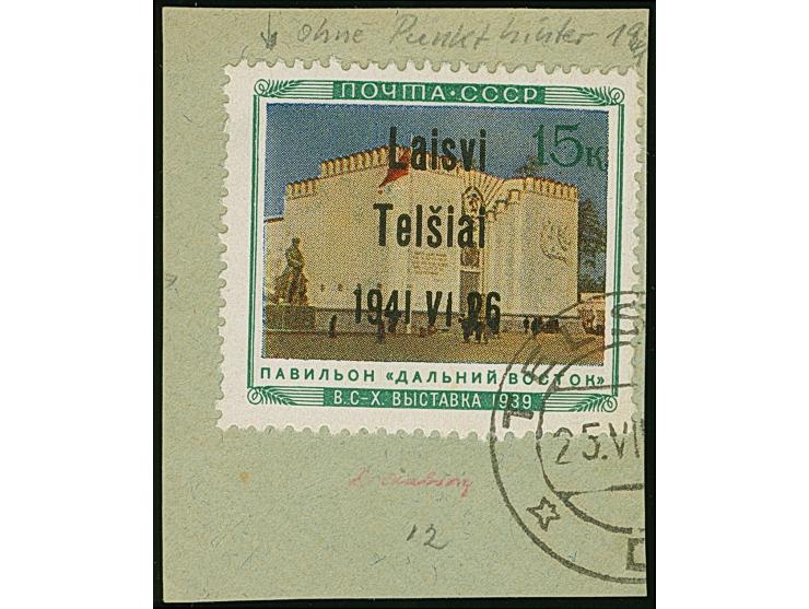 1941, Pavillon Ferner Osten 15 Kopeken, Aufdrucktype IIIb, Aufdruckfeld 2, sauber mit Stempel “TELS(IAI) 25.VII.(41)” auf Briefstück, tadellos, u.a. sign. Z. Mikulski