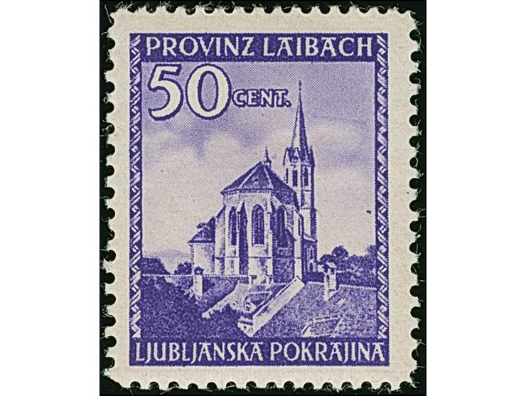 1945, Ansichten aus Slowenien Kapitelkirche in Rudolfswert 50 Centesimi dunkelviolett, mit Plattenfehler “Farbstrich rechts vom Kirchturm”, postfrisch, tadellos, sign. Krischke