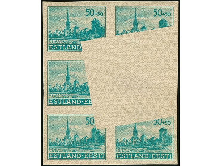 1941, Wiederaufbau Ansichten von Reval 50 Kopeken, 6er-Block mit markantem Druckausfall bzw. einem komplett fehlendem Markenbild, vermutlich durch Fremdauflage auf der Druckplatte, postfrisch, tadellos