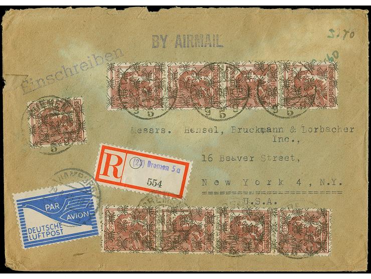 Netz auf Arbeiter 60 Pfg. karminbraun, zwei senkrechte 4er-Streifen und Einzelwert je mit Stempel “BREMEN 28.8.48” als tarifgerechte Mehrfachfrankatur auf R-Luftpostbrief bis 40g mit JEIA-Zulassungsmarke mit Stempel “HAMBURG 29.8.48” nach New York mit Ankunftsstempel Der Umschlag mit kleinen Randfehlern und etwas verfärbt, die Marken sind in einwandfreier Erhaltung. Trotz der Einschränkungen eine außergewöhnliche Mehrfachfrankatur auf Übersee-Luftpostbrief zur JEIA-Zeit