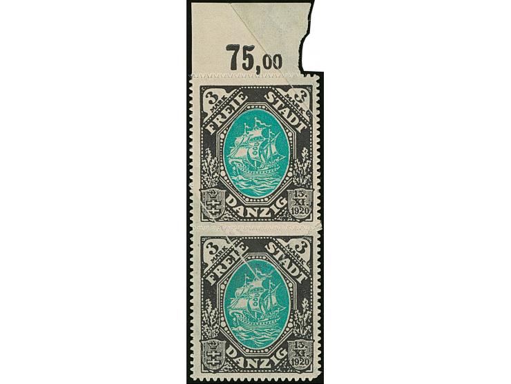 1921, Kogge 3 Mark, senkrechtes Oberrandpaar mit geklebter Papierbahn durch den Oberrand sowie die Marken, postfrisch, Falz im Rand, tadellos und sehr dekorativ