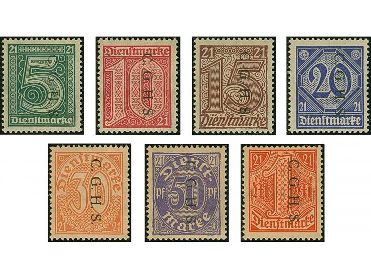 1920, 5 Pfennig - 1 Mark, Probeaufdruck in größeren Lettern, Aufdruckstellung I (senkrecht von oben nach unten), sauber ungebraucht, 10 Pfennig unmerklicher Bug, sonst tadellos. Eine große Seltenheit, ProFi hat keine weiteren Stücke registriert, unsigniert mit Fotoattest Gruber BPP (2013)