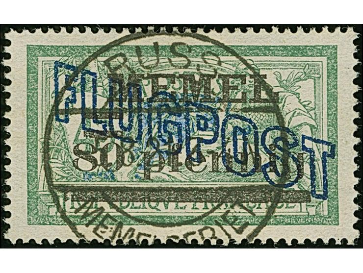 1921, Flugpost 80 pfennig auf 45 Centimes dunkelgrün/grauultramarin auf GC-Papier, farbfrisch und ausgabetypisch gezähnt, sauber mit vollem Stempel “RUSS MEMELGEBIET -5.8.21” entwertet, tadellos, eine seltene Marke, Fotoattest Huylmans BPP (2014)