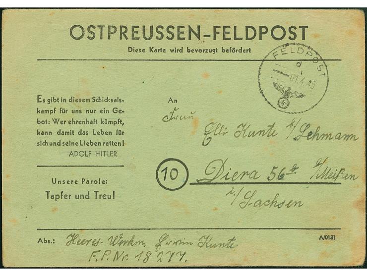 Ostpreussen-Feldpostkarte mit fetter kleiner Inschrift auf grünem Karton, gebraucht mit Normstempel “d 1.4.45” und Absendervermerk mit Feldpostnummer “18277” nach Diera bei Meißen. Die Karte hat Altersspuren und kleine Beförderungsspuren im Rand, eine äußerst seltene Karte