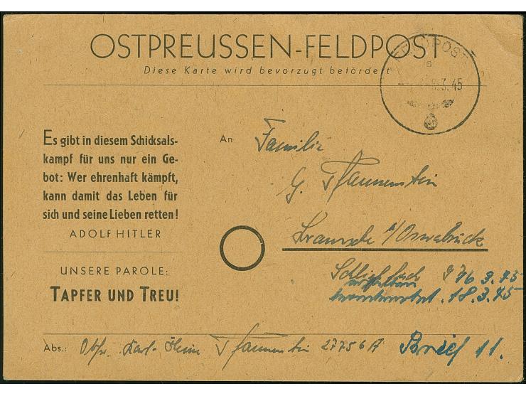 Ostpreussen-Feldpostkarte auf hellbraunem Karton, gebraucht mit Normstempel “d 6.3.45” und Absendervermerk mit Feldpostnummer “27756A” nach Bramsche bei Osnabrück. Die Karte mit Eckbug rechts oben, ansonsten in guter Erhaltung