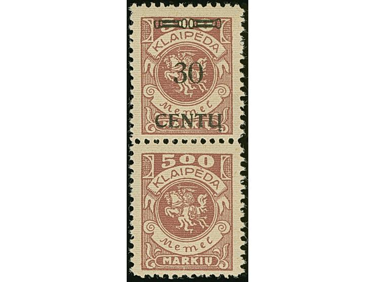 1923, Neue Währungsbezeichnung 30 Centu auf 500 Mark, senkrechtes Paar, Felder 48 und 58, die obere in Aufdrucktype AIV, die untere ohne Aufdruck, ungebraucht (obere Marke) bzw. postfrisch, tadellos. Eine seltene Abart, ProFi hat kaum ein Dutzend solcher Stücke registriert, sign. Dr. Petersen BPP sowie Fotoattest Huylmans BPP (2015)