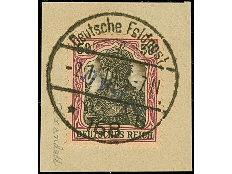 1919, Aufdrucktype II, violettblauer Aufdruck: Germania 50 Pfennig dunkelgraulila/schwarz, kopfstehender Aufdruck, farbfrisch und gut gezähnt, sauber mit Stempel “Deutsche Feldpost * 168 b -2.1.19. 6-7N.” auf Briefstück, tadellos, u.a. sign. Strandell,Mikulski und Dr. Hochstädter, je mit Fotoattest (1954,1976, 1980)