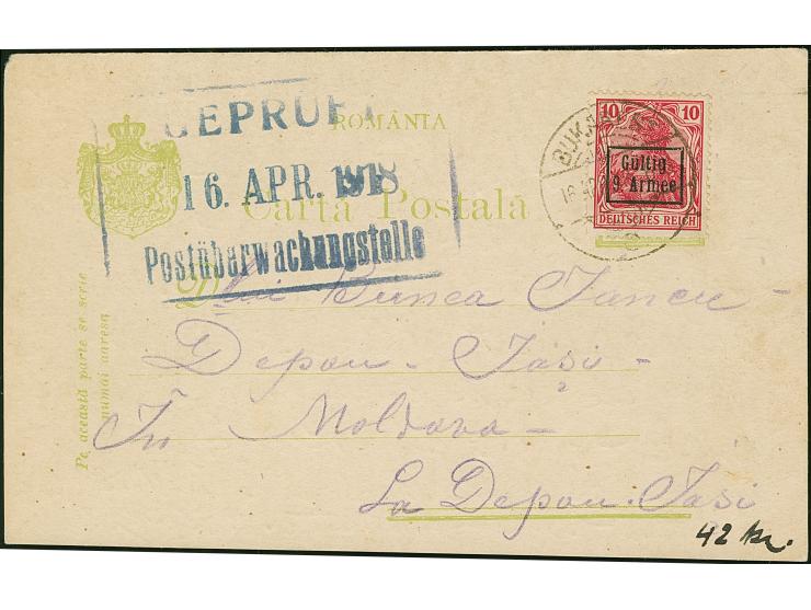 1918, Germania 10 Pfennig karminrot, Kriegsdruck, farbfrisch und gut gezähnt, sauber mit Stempel “BUKAREST 16 APR 18” auf als Formular verwendeter Ganzsachenkarte mit nebengesetztem Zensur-Ra3 “GEPRÜFT 16 APR. 1918 Postüberwachungsstelle” nach Lasi, einem unbesetzten Teil Rumäniens. Der Postverkehr mit der Moldau war erst ab dem 8. Mai 1918 wieder freigegeben, ein sehr interessantes Stück, in dieser Form kein weiteres registriert, Fotoattest Wasels BPP (2016)