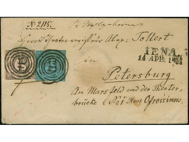 6 Kr. auf lebhaftgraurot und Farbänderung 3 Kr. auf hellgrautürkis, mit jeweils sauber aufgesetzter Nr. "115" und nebengesetztem L2 "JENA 14 APR 1861" auf Briefkuvert an den Schriftsteller und Direktor des St. Petersburger Hoftheaters, Alexander Tollert. Ein attraktiver und interessanter Brief nach Russland.