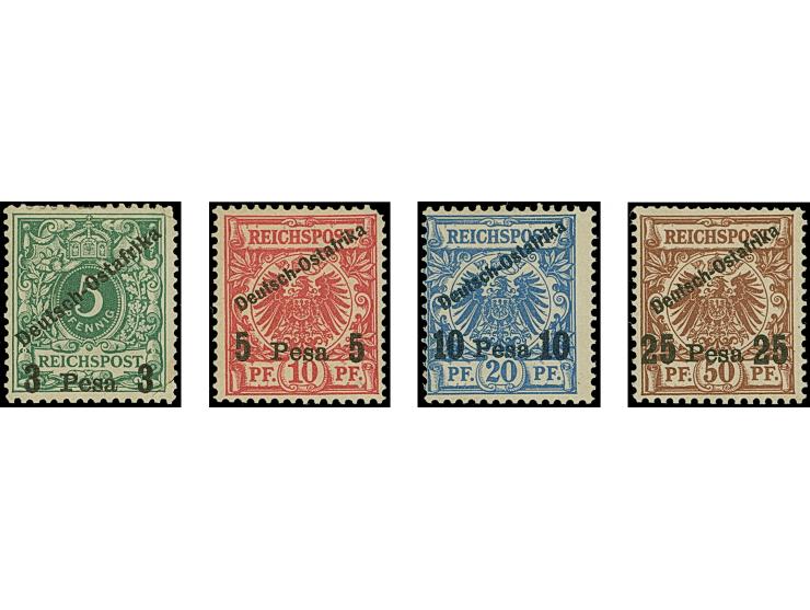 "Deutsch-Ostafrika", einzeiliger kleiner Probeaufdruck auf 3 P. – 25 P. (auf 10 P. in blau), ungummiert, die beiden kleinen Werte Eckfehler.