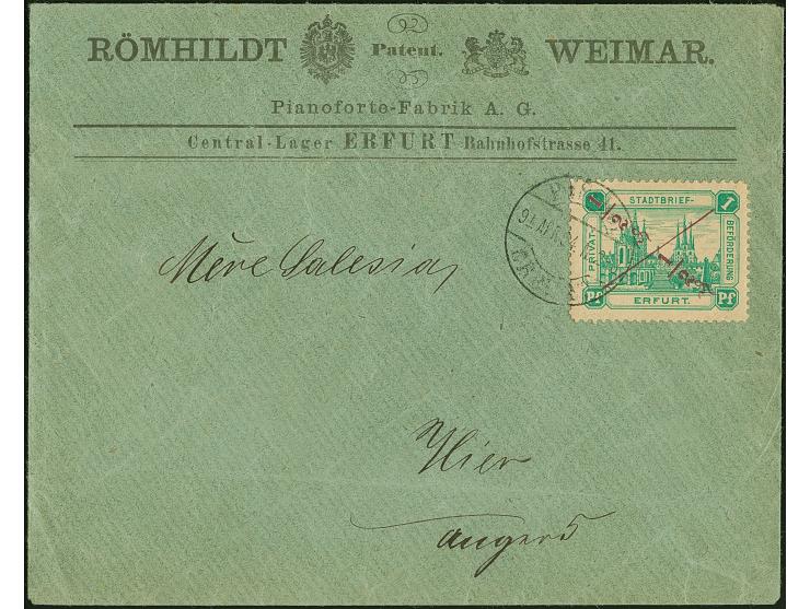 Erfurt-Privat-Stadtbrief-Beförderung: 1888, ½ d auf 1 Pfg. grün, Aufdrucktype I mit Stempel “Pr.St.Bef. ERFURT 9.APR.94” auf Drucksachen-Vordruckumschlag “Rönhild Weimar Pianoforte-Fabrig A.G.”. Der Umschlag mit Beförderungsspuren, die Marke ist in einwandfreier Erhaltung