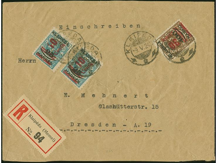 1923, 10 Centu auf 25 Mark auf 10 Centu grünlichblau, zwei Einzelmarken sowie 30 Centu auf 400 Mark auf 1 Litas, 1 Wert zu 10 Centu mit markantem Aufdruckfehler “große Kerbe in 1 von 10 der Wertangabe”, sauber mit Stempel “KLAIPEDA 9.V.24” auf portogerechtem R-Brief nach Dresden, tadellos, selten und dekorativ, sign. Dr. Petersen BPP sowie Fotoattest Huylmans BPP (2015)