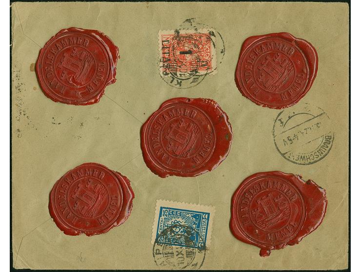 1923, Angliederung des Memellandes an Litauen 1 Litas auf 2000 Mark mit litauischer Zufrankatur, rückseitig mit Stempel “KLAIPEDA 10.XI.25” auf Wertbrief über 5 USD nach Braunschweig, rückseitig fünf dekorative Wachssiegel “HANDELSKAMMER MEMEL”, Brief unten kleiner Einriss, sonst gute Erhaltung