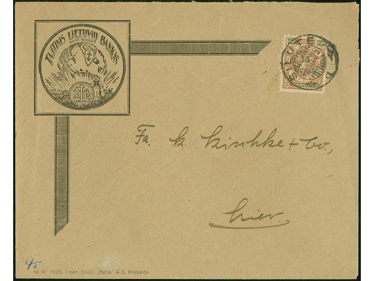 1923, 24-Werte 15 Centu auf 10 Mark braun, farbfrisch und gut gezähnt, sauber mit Stempel “SILUTE 5.III.25” auf portogerechtem und dekorativen Orts-Vordruckumschlag “TAUTINIS LIETUVIU BANKAS”, tadellos
