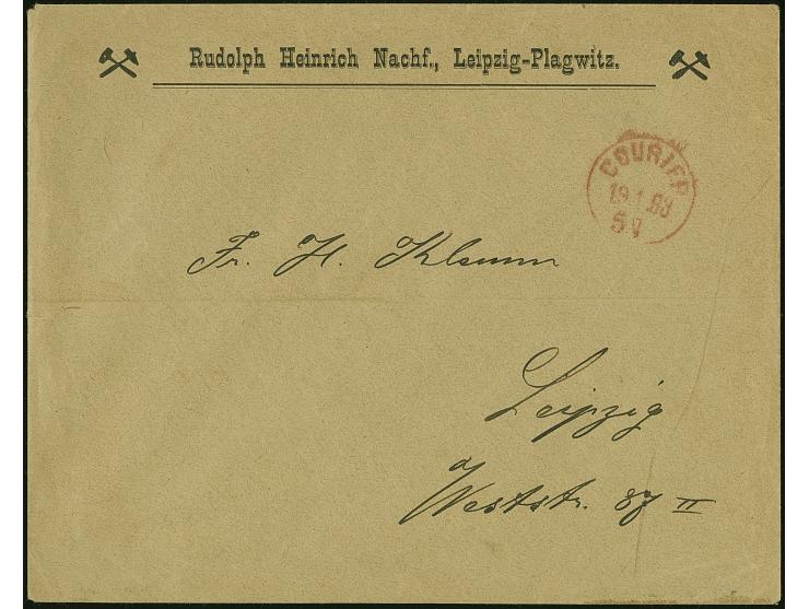 Leipzig-Courier: 1893, roter Stempel “COURIER 19.1.93” für Barfrankatur bei Drucksachen auf Vordruck-Kuvert “Rudolph Heinrich Nachf., Leipzig-Plagwitz” im Ortsverkehr. Umschlag rückseitig etwas fleckig und leichte waagerechte Faltung, ansonsten in guter Erhaltung