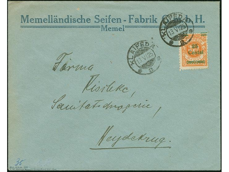 1923, 24-Werte 25 Centu auf 25 Mark orange, farbfrisch und ausgabetypisch gezähnt, mit Urmarkenplattenfehler “letztes A von KLAIPEDA rechts unten verkürzt sowie diagonaler Bruch im Rahmen um KLAIPEDA bis zum rechten Markenrand”, sauber mit Stempel “KLAIPEDA 13.VI.25” auf portogerechtem Brief nach Heydekrug, der Umschlag rückseitig gering verfärbt, sonst tadellos
