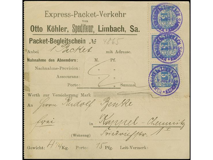 Limbach-Express-Packet-Verkehr: 1891, 5 Pfg. ultramarin im waagerechten Dreierstreifen mit violettem Stempel “UEBERGABE In LIMBACH SACHSEN 7.AUG.93” auf Packet-Begleitschein nach Kappel-Chemnitz. Das Formular mit senkrechter Faltung und kleinen Randspuren, die Marken sind in einwandfreier Erhaltung. Eine sehr seltene Mehrfachfrankatur und bisher sind nur wenige Begleitscheine bekannt