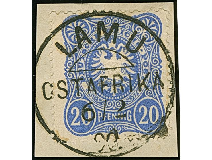 20 Pfennig ultramarin mit zentrischem Stempel "LAMU 6/2 90" auf Briefstück.