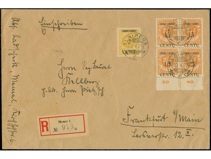 1923, 15 Centu auf 25 Mark, Unterrand-Viererblock von den Druckfeldern 83-84 und 93-94, Feld 94 mit Aufdruckfehler “Aufdruck 5 statt 15” zusammen mit 2 Centu auf 20 Mark mit Stempeln “KLAIPEDA 30.V.23” auf winzig überfrankiertem R-Brief nach Frankfurt mit Ankunftsstempel, tadellos. Ein sehr seltener Brief, ProFi hat nur drei  weitere Briefe (einer mit stark defekter Marke) mit dieser Abart auf Ganzstück registriert, Fotoattest Huylmans BPP (2013)