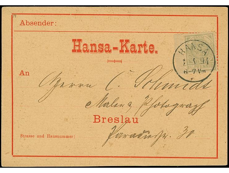 Hansa: 1893/94, Randstück 1½ olivgrau mit Stempel “HANSA 1.4.94” auf Hansa-Vordruckpostkarte mit roter Inschrift und rückseitigem Zudruck “Ohlauer Thor- Ressource” im Ortsverkehr, in einwandfreier Erhaltung