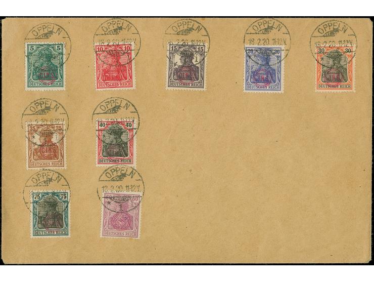 Handstempel in rot: Germania 5-40 Pfennig sowie 60 und 75 Pfennig, jeder Wert einzeln sauber gestempelt “OPPELN 18.2.20” auf Blanko-Kuvert, wenige Werte mit Zahnunregelmäßigkeiten, 60 Pfg. ein Zahn winzig fleckig, bzw. 30 Pfennig unauffällig ergänzter Eckzahn, ansonsten in tadelloser Erhaltung. Eine der größten Raritäten der Deutschland-Philatelie, Fotoattest Weinberg BPP (1994) und Fotoattest Gruber BPP (2026)