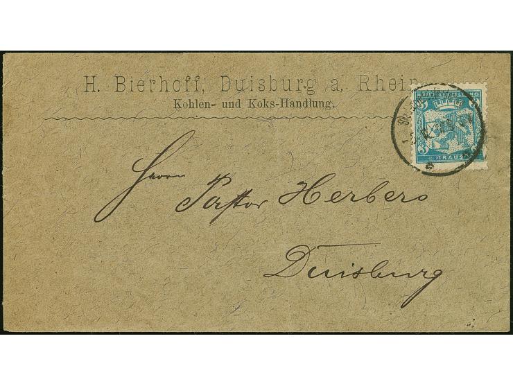 1896, Düsseldorf 3 Pfg. blau auf weißem Papier mit Stempel “Stadtbrief-Beförderung 6.V.96” auf Vordruck-Briefkuvert “H. Bierhoff, Duisburg a. Rhein - Kohlen- und Koks-Handlung”. Der Umschlag mit senkrechter Faltung und rückseitig mit Öffnungsfehlern, ansonsten in guter Erhaltung